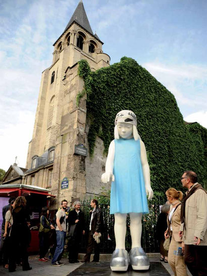 Una niña poco mas alta de 4 metros, con sindorme de dawn, intenta tomar algo en el espacio urbano, jugando con la percepción que tenemos de la infancia, su poder en nuestras vidas y los clichés acerca de los prejuicios sociales